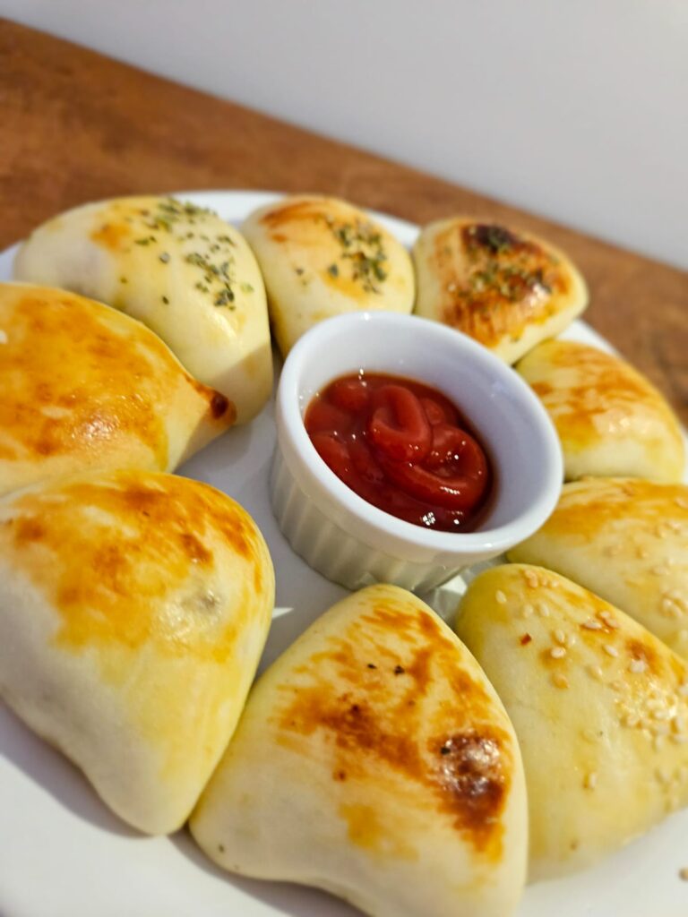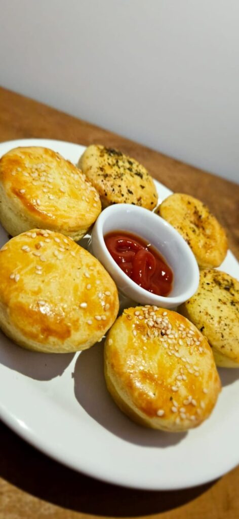 Pão de queijo empanado com provolone, pão de queijo tradicional, pão de queijo gratinado, Esfirras, mini esfirras, empadas artesanais, croissant.